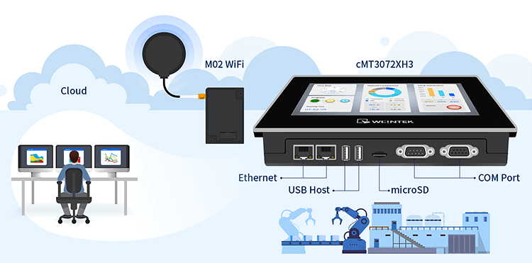 Встроенные интерфейсы панели позволяют гибко интегрировать ее в инфраструктуру предприятия. Два независимых порта Ethernet дают возможность разделить сети управления и промышленного цеха, повышая безопасность системы. К стандартным COM-портам и USB добавлена поддержка опционального Wi-Fi модуля M02, который устанавливается в специально отведенное место с тыльной стороны панели. Также устройство полностью совместимо с облачными сервисами Weincloud, что упрощает удаленный мониторинг через WebView или создание дашбордов в браузере.